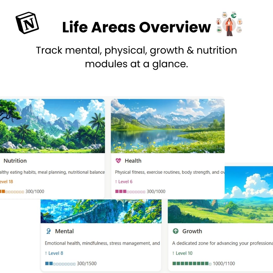 Transform your life into an epic RPG with Gamified Life OS. Earn XP, level up skills, track habits, manage finances, and become the hero of your own story in Notion.